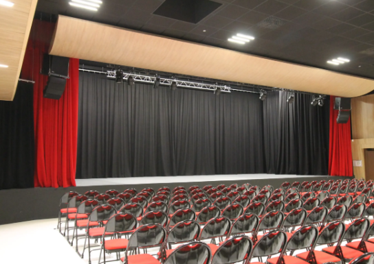 Installation de rideaux de scène et pendrillons.
